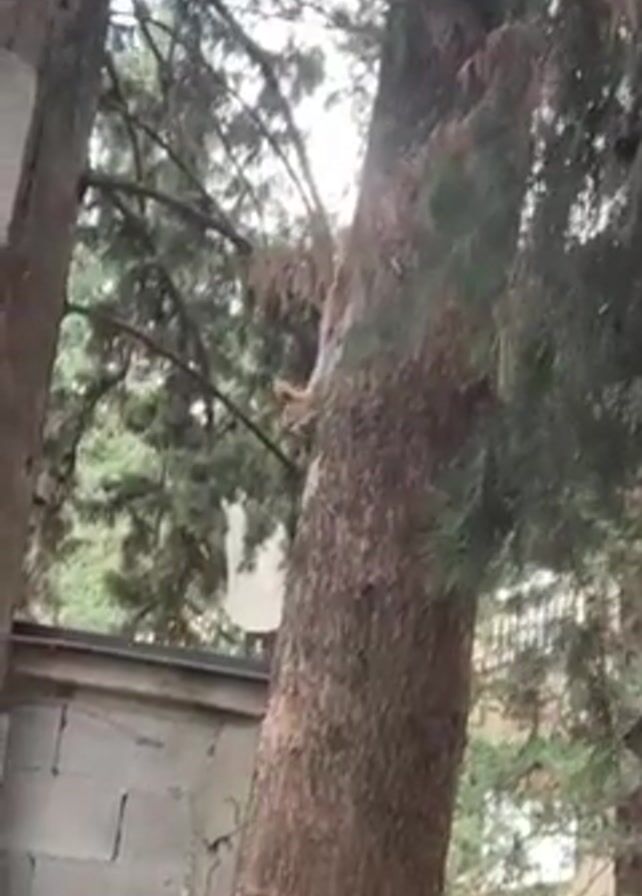 squirrel climbing a tree, with parts of buildings visible in the background. The squirrel is seen against the backdrop of green leaves and the tree's brown bark.
