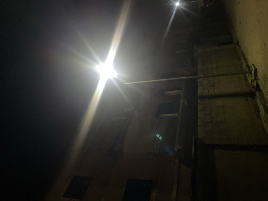 A building's exterior is illuminated by two street lights at night. The facade appears to be a mix of brick and smoother material. A metal bar is affixed to the wall, running horizontally. A ladder or scaffolding structure is attached to the building's side. The lighting creates high contrast with deep shadows and bright highlights.