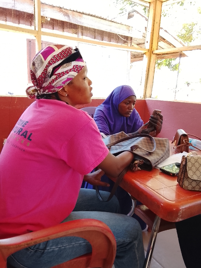 Two women are seated at an orange plastic table in a semi-open indoor or sheltered outdoor area in Lafia, Nigeria