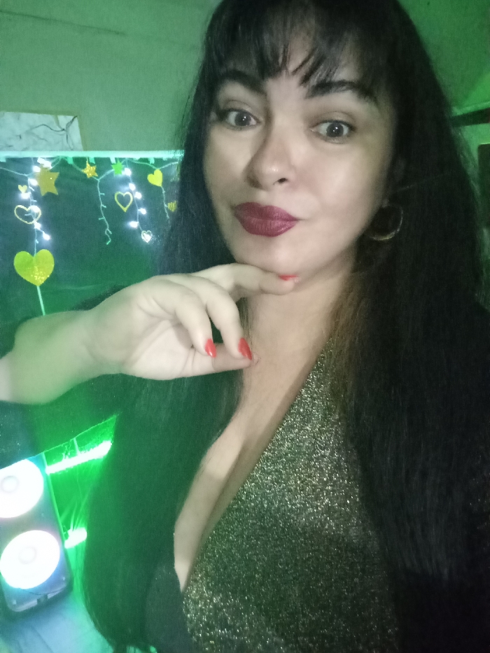 The image depicts a female subject in an indoor setting within the city of Juan Griego, Venezuela. The subject, positioned centrally and filling most of the frame, has dark hair with bangs, wide-set eyes, and is wearing dark red lipstick. She has a faint smile and her right hand is placed beneath her chin, with red nail polish visible on her fingernails. She is wearing a deep V-neck top with a golden, glittery texture. Small, dark hoop earrings are visible on her right ear. The background on the left features a string of decorative lights consisting of small white LEDs interspersed with yellow glitter hearts and stars. Below these decorations, a mobile phone is visible, displaying two illuminated white circular patterns on its screen and emitting a strong green light. The overall lighting conditions include a prominent green tint, particularly on the left side of the frame. The wall behind the subject appears dark.