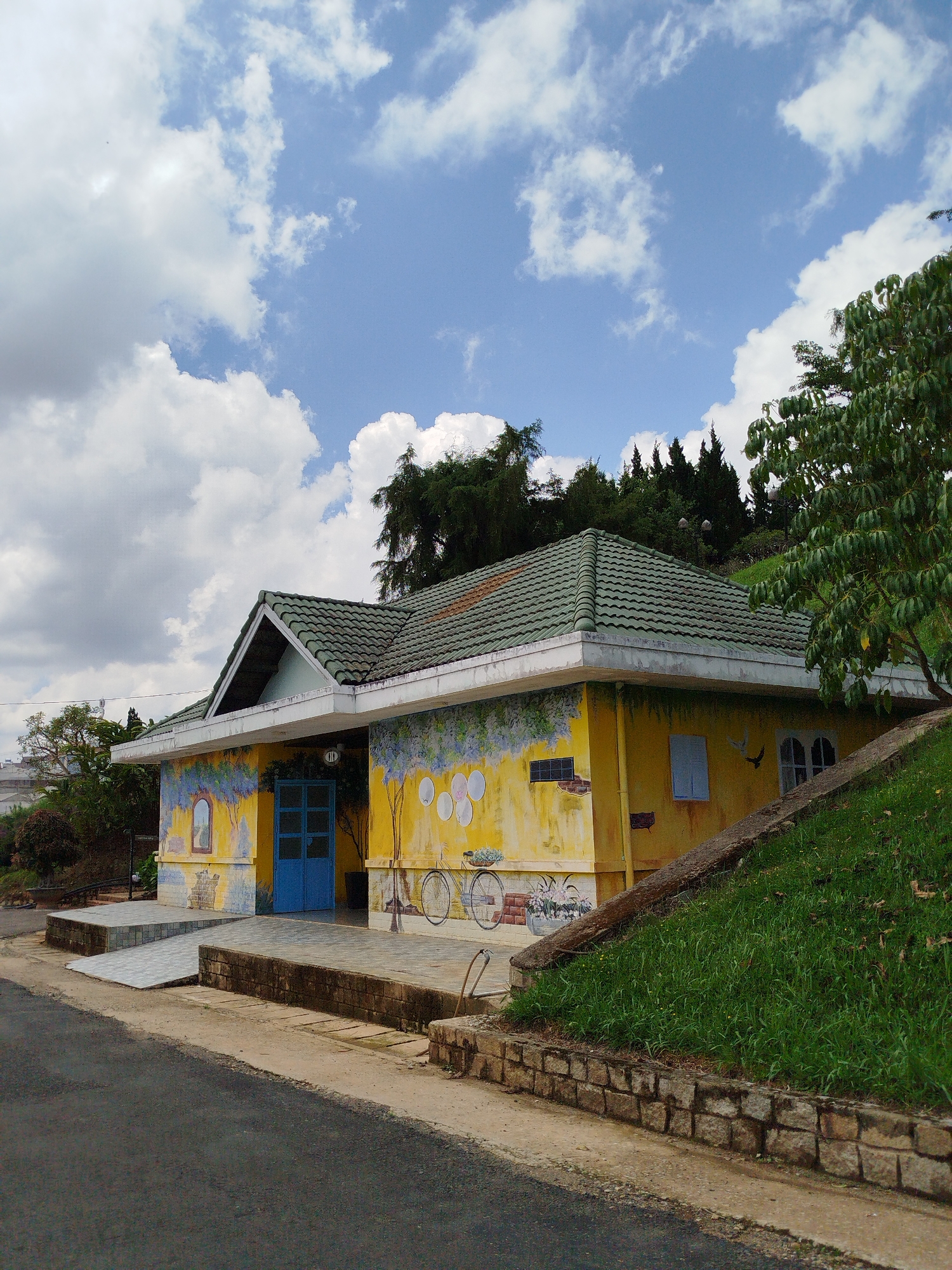 small, single-story yellow building with a green tile roof, located in Lam Vien - Da Lat, Vietnam