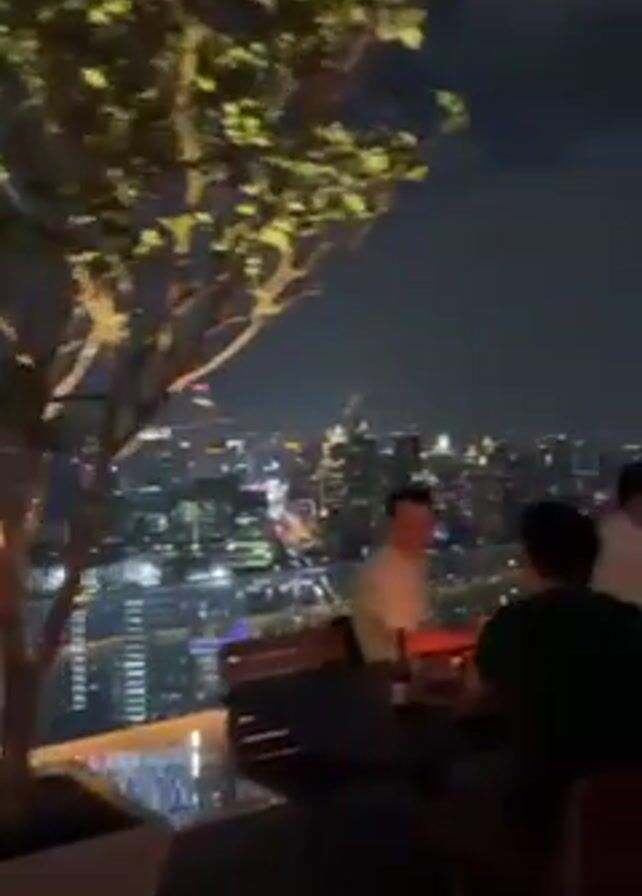 nighttime view from a rooftop bar overlooking a city. Several people are seated at tables, some talking and enjoying the view. A potted tree is visible in the foreground, illuminated by a spotlight. The city skyline is visible in the background, with numerous lit buildings. One man stands near the edge of the rooftop, looking at his phone. The atmosphere appears relaxed and social.