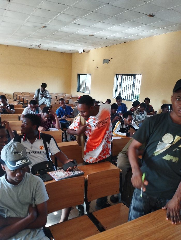 An indoor classroom with many people seated at wooden desks. Most are casually dressed, some holding phones. The walls are a light yellow color, with windows having metal bars. A white ceiling appears damaged. The room seems filled with students, some looking at their phones, others talking.