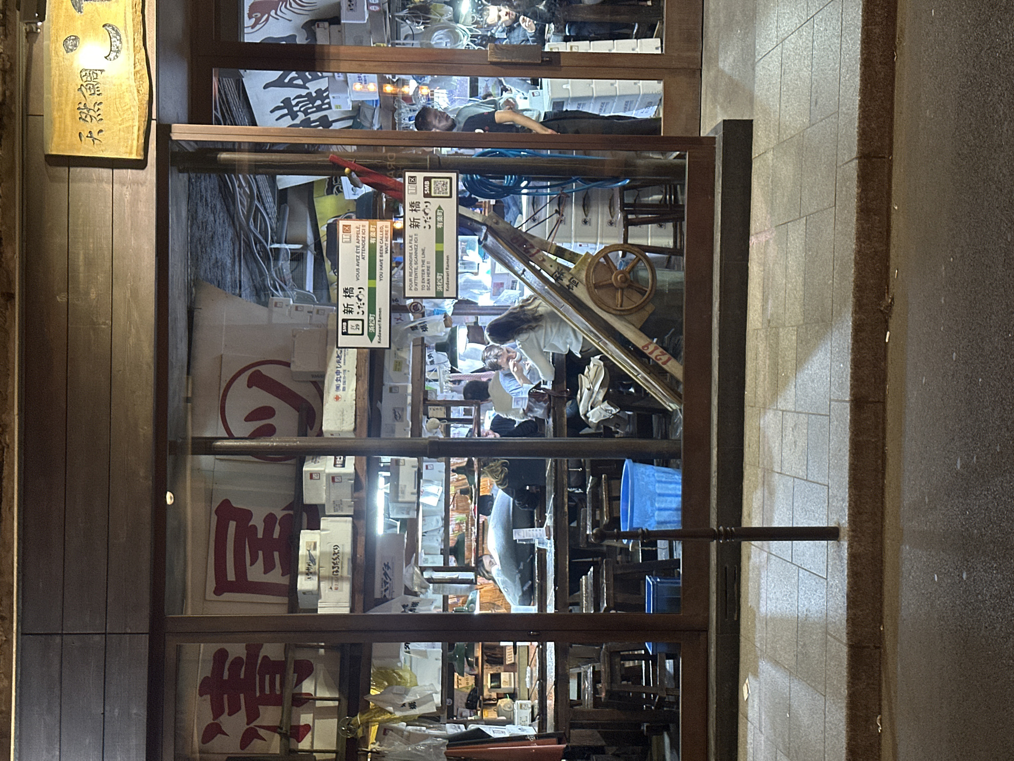 exterior of a Japanese restaurant. Signs in both Japanese and French can be seen inside. In the upper window, a person is lying down. Below that, several people are seated at tables. Various objects and signs are visible inside the restaurant, including banners with Japanese characters and signs with text in multiple languages, including Japanese, French, and English. The restaurant has a wooden frame around the glass windows. Outside, part of a sidewalk is visible on the right side of the image. The OCR mentions the name of the restaurant, "Kodawari Ramen," along with the location, "新橋 (Shinbashi)" and "浜松町 (Hamamatsucho)," which are neighborhoods in Tokyo, Japan.