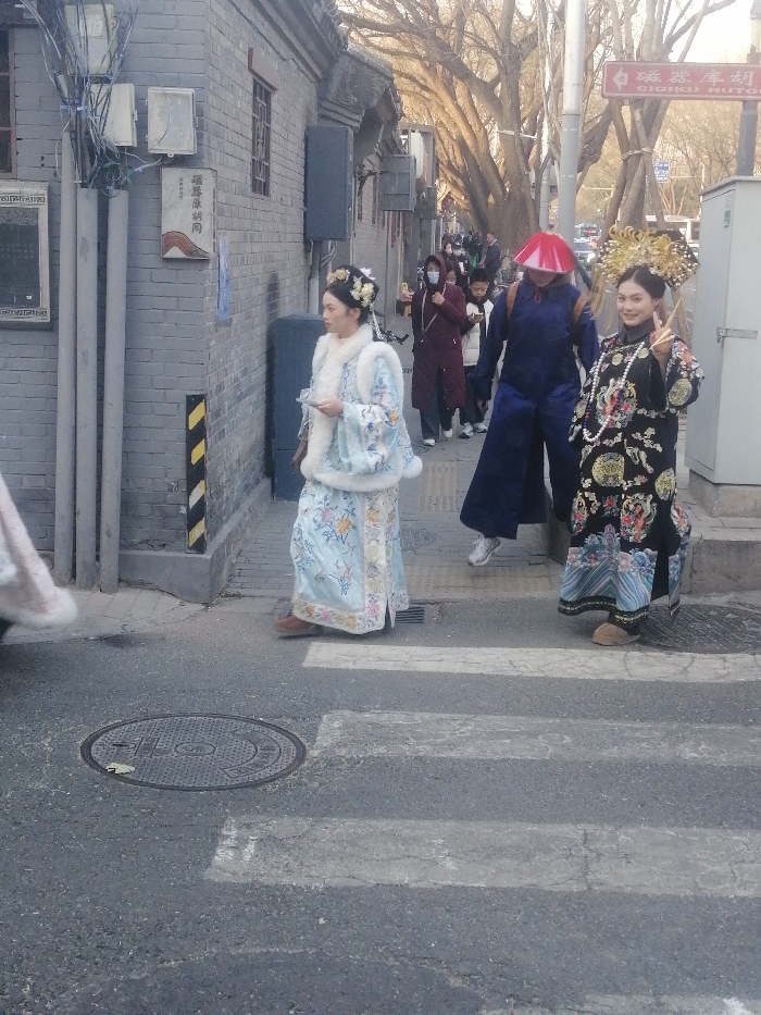 The image captures a street scene in Ciqiku Hutong, Dongcheng District, Beijing, China. The environment consists of an asphalt road featuring a manhole cover and white pedestrian crossing stripes. To the left, a row of grey brick buildings with traditional Chinese architectural elements and utility poles with exposed wiring are visible. Bare-branched trees line the right side of the street, suggesting a cold season. Three primary figures are present in the foreground. A woman on the left wears a light blue traditional Chinese dress adorned with floral embroidery, a white fur-trimmed vest, and a decorative floral hairpiece. She holds a small, unidentified object in her hands and is in motion, stepping from right to left across the road. To her right, a second woman wears a dark, elaborately embroidered traditional Chinese robe, a long white beaded necklace, and a prominent, ornate golden headdress. She holds two thin, dark implements in her right hand, forming a "V" gesture, and smiles towards the camera. Behind these two, a third individual, partially obscured, wears a dark blue garment and a wide, red conical hat. In the background, several other pedestrians in contemporary winter attire, some wearing face masks, are walking further down the street. The scene is illuminated by natural daylight.