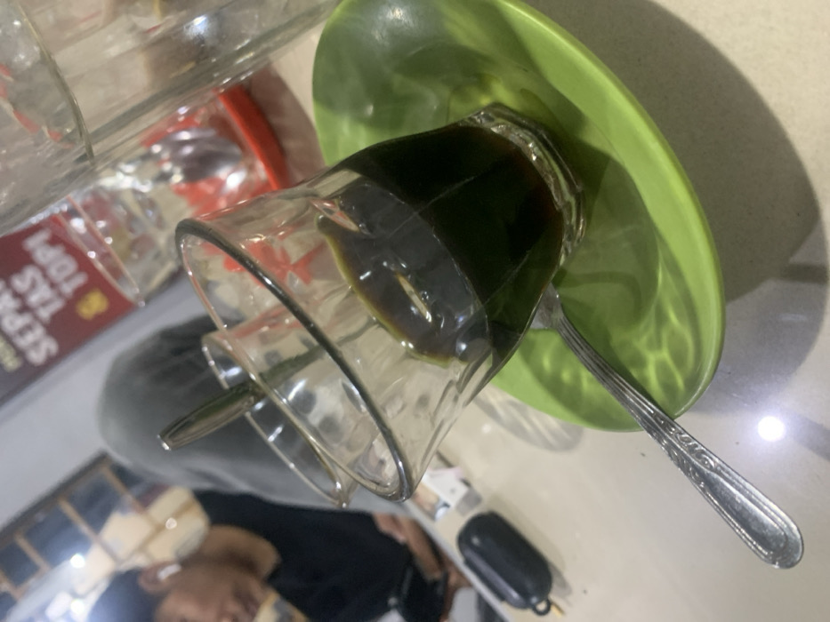 The image depicts an indoor scene within a cafe or similar establishment in Lhokseumawe, Indonesia. In the foreground, a clear glass containing a dark liquid, consistent with coffee, rests on a lime green, wave-patterned saucer. A silver spoon is positioned on the saucer beneath the glass. To the left of the glass, on a light-colored tabletop, a black earbud charging case is visible. The background is blurred, showing a person on the left, likely a male, wearing a dark shirt and a white earbud in their right ear, looking down at an object held in their hands. Another individual, partially visible behind the foreground objects, is wearing grey clothing. In the upper background, a red sign with white text, partially readable as "SEPAT TAS & TOPI" (Shoes Bags & Hats), is present. Several other empty clear glasses and a large clear bottle are visible on tables in the background. The environment is illuminated by artificial lighting.