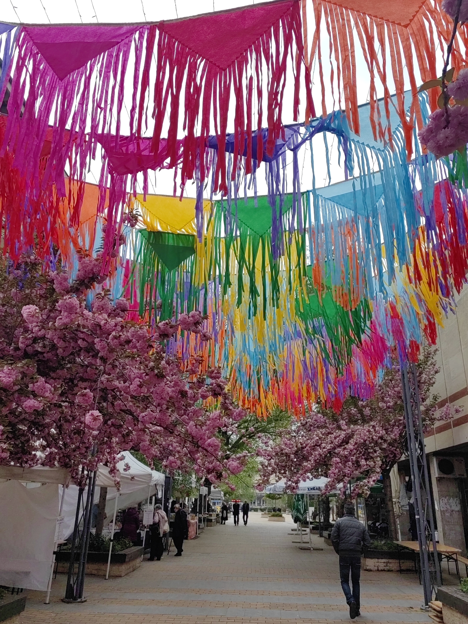 The image captures a pedestrian street in Gorna Oryahovitsa, Bulgaria. Above, a colorful canopy of triangular fabric flags and streamers creates a festive atmosphere. Below, trees with pink blossoms flank the brick-paved walkway. People stroll along the street, some walking away from the camera, others visible in the distance. Tents are set up along the sides of the walkway, suggesting a market or event. A man walks towards the camera, wearing a dark jacket and jeans. Buildings are visible on either side of the street, one featuring a bench and metal support structure.