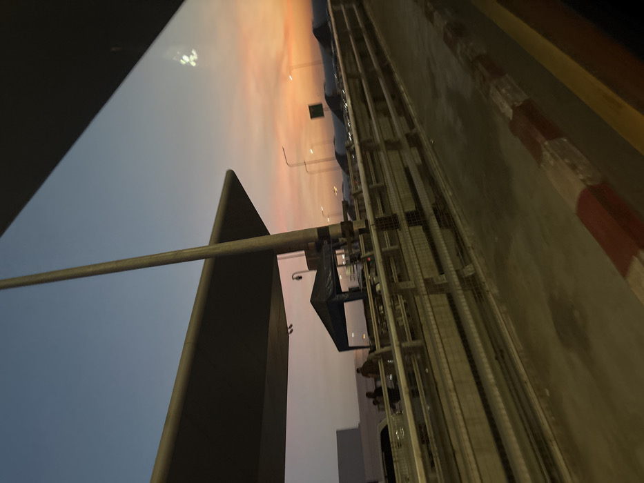 A sideways view reveals a cityscape at dusk. The sky blends from orange to blue, with streetlights dotting the horizon. A tall, gray structure with a sign obstructs part of the view. Metal pipes and a wire fence run alongside a sidewalk marked with red and white stripes. The overall scene is urban and industrial.