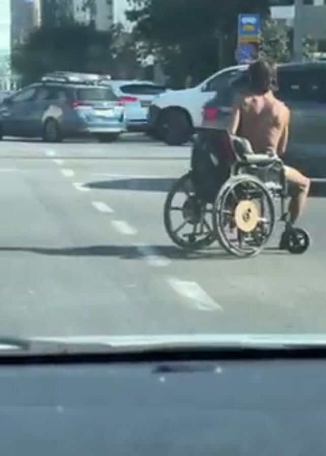 From the perspective of a driver waiting at a traffic light, a shirtless man in a wheelchair is seen alone in the middle of a busy city street intersection