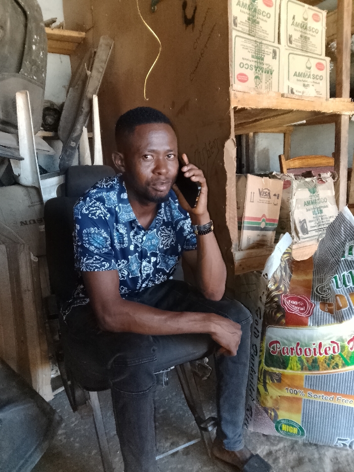 The image depicts a dark-skinned man seated on a dark office-style chair inside what appears to be a cluttered shop or storage area in Jos, Nigeria