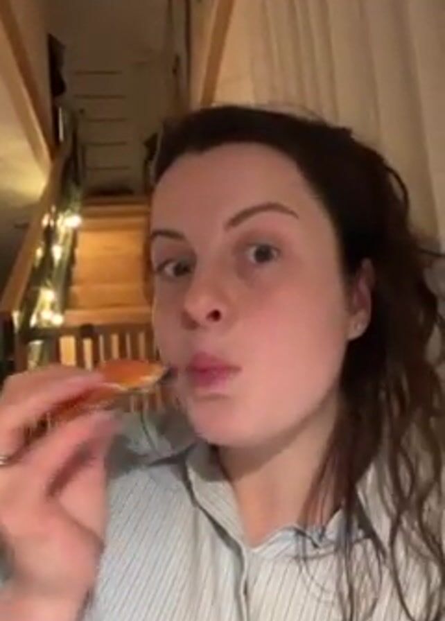 A woman with brown hair, wearing a blue and white striped shirt and a ring on her left hand, is eating something that appears to be orange, perhaps a sandwich or snack. She looks directly at the camera while she chews. The background shows a staircase with lights and a white curtain. The lighting is warm.