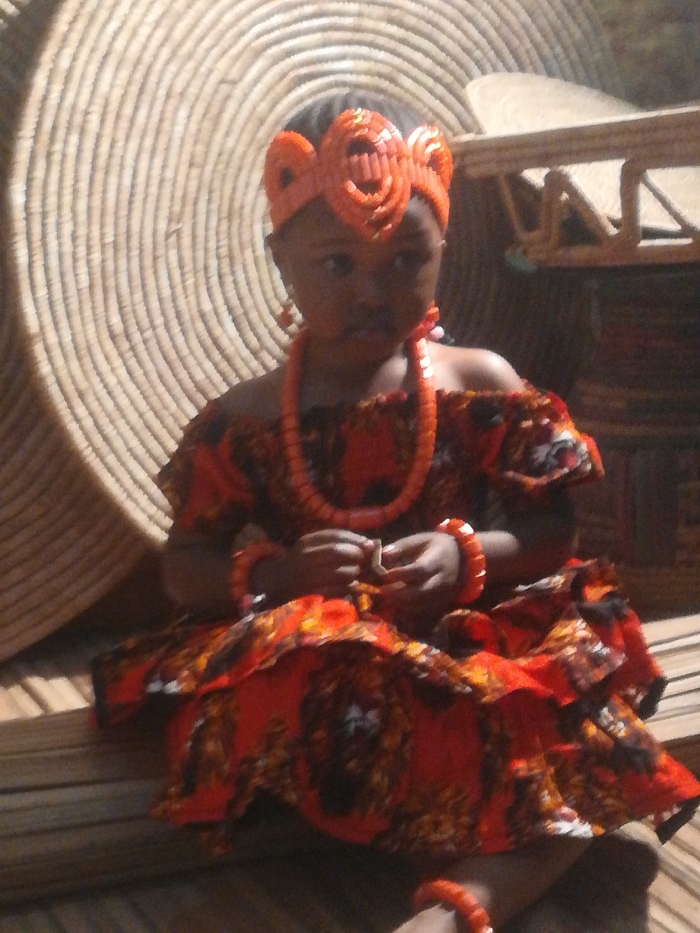 A young child is seated in a front-facing posture, slightly angled to the viewer's right. The child wears an elaborate orange beaded crown, a multi-strand orange beaded necklace, orange beaded earrings, and orange beaded bracelets on both wrists, with an additional orange beaded bracelet on the left lower leg. The attire includes an off-the-shoulder dress made from a patterned fabric featuring shades of red, orange, black, and brown, with ruffled sleeves and a full skirt. The child's hands are clasped in the lap, holding a small, indistinct object. The background to the left features a large, circular, woven straw or wicker object with prominent concentric ring patterns. To the right, additional woven structures, possibly furniture, are visible. The child is seated on a surface composed of woven straw or wicker material. The scene is located in a structure within the city of Unknown, Unknown.