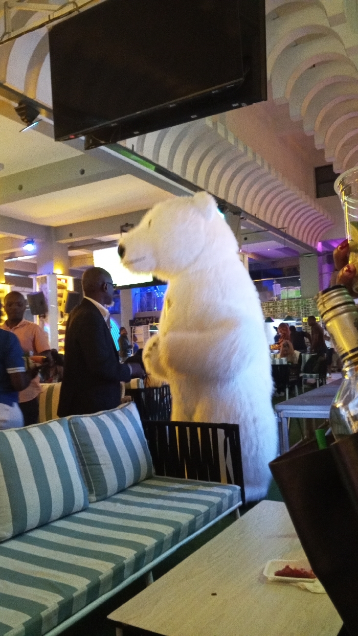 Inside a well-lit venue, a large white polar bear mascot stands near a man in a suit. A striped blue and white sofa is in the foreground, with a table and a plastic tray of food. Other people are seated in the background. Overhead, a large television screen is mounted, and decorative white arches line the ceiling. A bar area is on the right.
