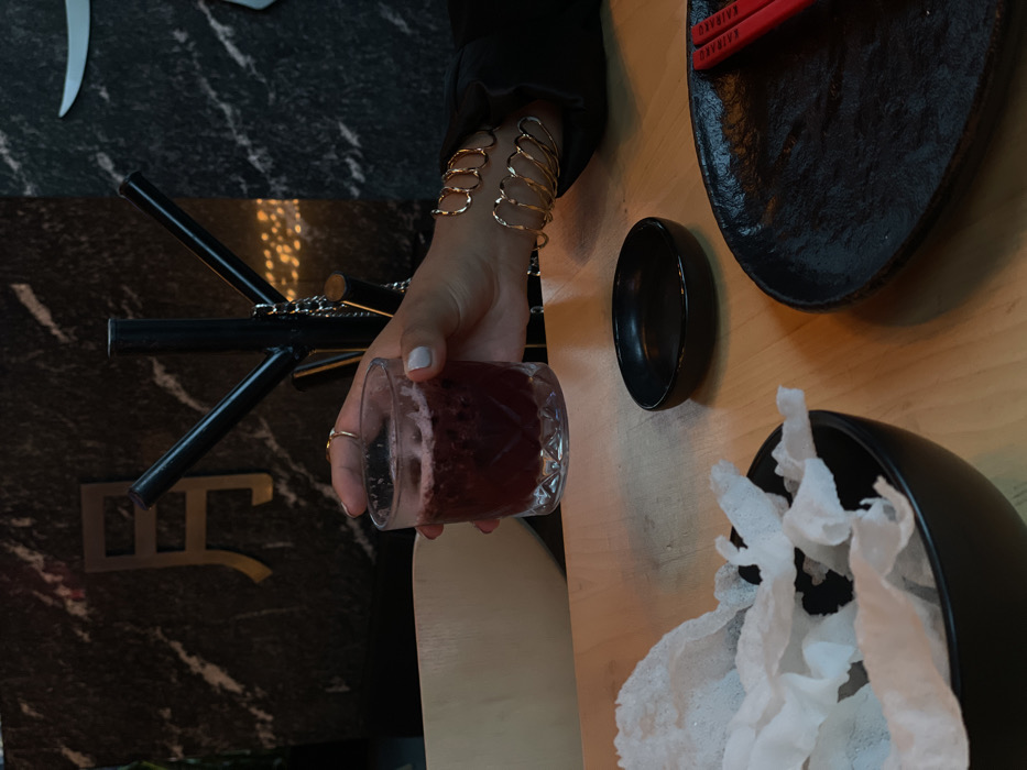 The image captures a close-up, elevated perspective of a dining scene at Tsuki Restaurante Japonés in Metepec, Mexico. A human hand, positioned centrally, holds a clear, faceted glass tumbler filled with a dark red, frothy beverage. The hand wears a silver ring on the ring finger, and multiple gold-colored, open-ended bracelets are stacked on the wrist. Fingernails are painted light gray. The arm is covered by a dark-colored sleeve. The objects rest on a light-toned wooden table. In the lower left foreground, a black bowl contains a quantity of white, irregularly shaped, translucent crispy food items. To the right, a small, black, round ceramic dish is present, and further right, a larger, textured black plate holds two red chopsticks. The background features a dark, marble-patterned wall adorned with a prominent gold-colored Japanese kanji character (月). A black metal stand with chains and blurred warm light sources are visible behind the hand and drink.