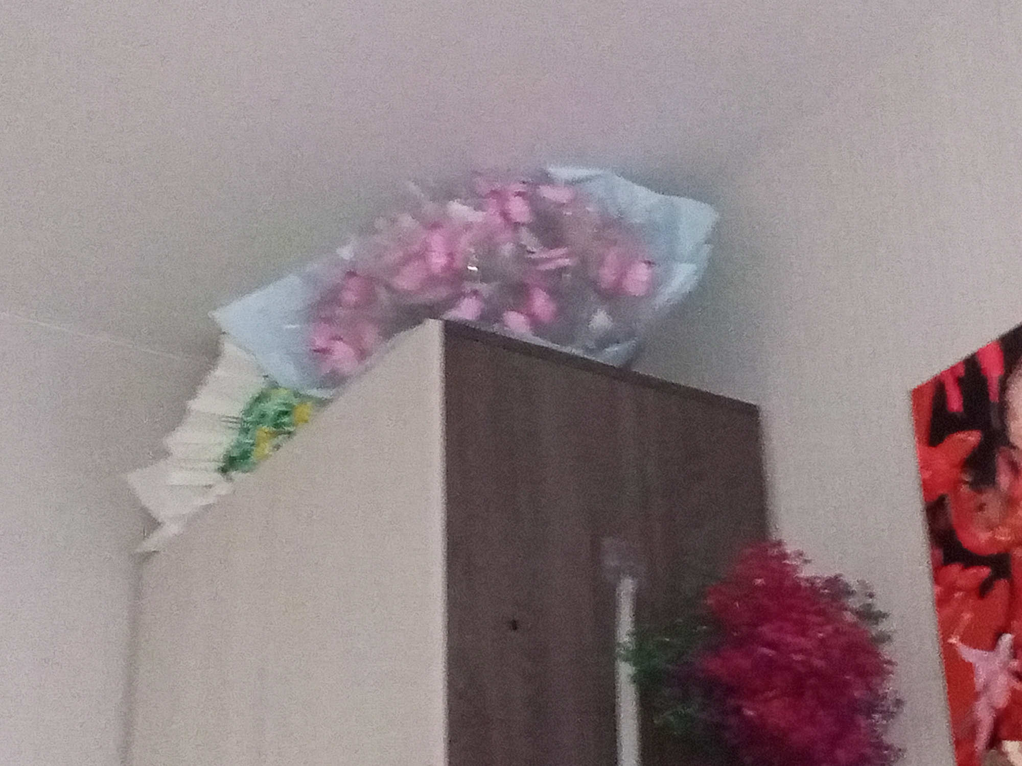 A medium shot captures an interior scene in what appears to be a room in Krasnogorskoye, Russia. The view is focused upwards towards the top of a two-tone cabinet, featuring a light-colored base and darker brown doors. Positioned on top of the cabinet, partially obscured by a light blue wrapping, is a large bouquet of pink flowers. More packaged items with green and white portions are adjacent to the bouquet. To the right of the cabinet, a partially visible wall displays a piece of art with dominant red tones and depicts figures in an abstract or surreal style. A cluster of smaller, deep pink flowers is situated to the lower right of the cabinet. The ceiling, in the upper portion of the image, is plain and white.