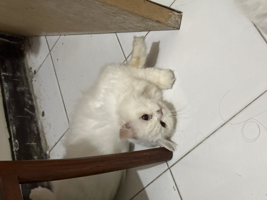 A white, long-haired feline (domestic cat) is depicted lying on its left side on a white tiled floor with grey grout lines, indoors, in the city of Sidoarjo, Indonesia