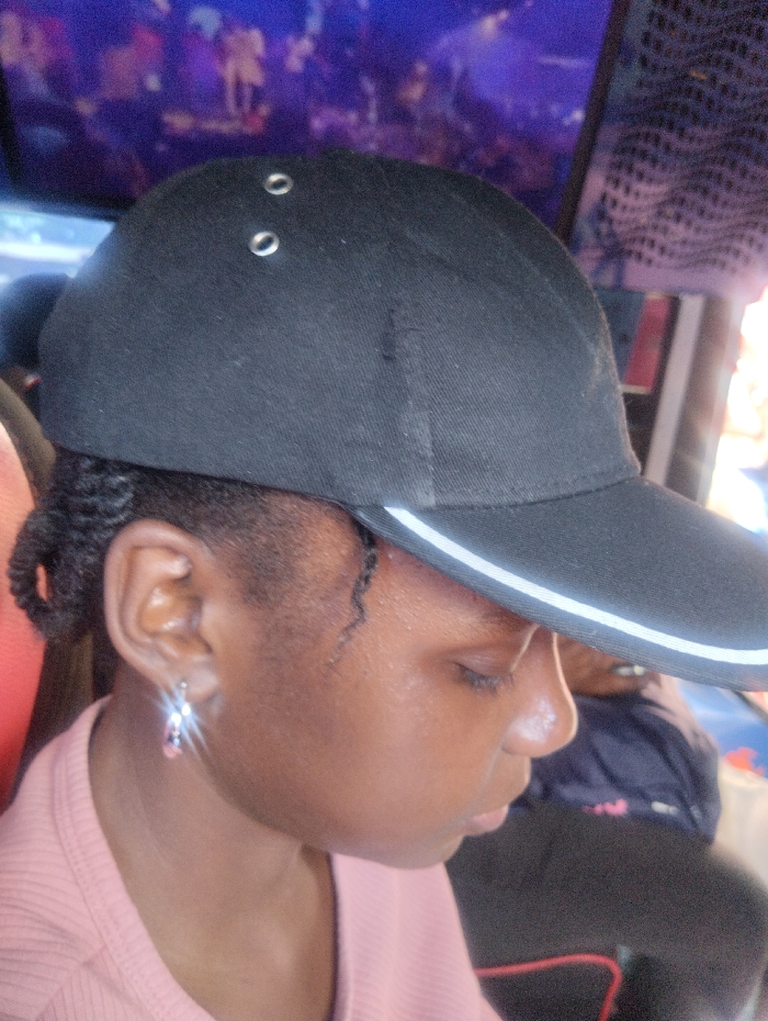 The image displays a young individual, gender indeterminate but likely female, in a right-side profile view. The individual has dark skin and is wearing a black baseball cap with a brim featuring two thin white stripes. Two metallic eyelets are visible on the upper side of the cap. Dark, braided hair is visible around the ear and temple, with a few loose strands. A reflective, teardrop-shaped earring is worn in the right ear. The individual wears a light pink, possibly ribbed, long-sleeved shirt. Their eyes are closed or directed downwards. The background is out of focus, revealing a blurred purple and blue illuminated area, possibly a screen displaying indistinct human figures. A dark, textured object, potentially a grille, is visible to the right of the background, and another out-of-focus dark blue/black object or person is present in the lower right. The scene is an indoor setting within Gatongora ward, Kenya.