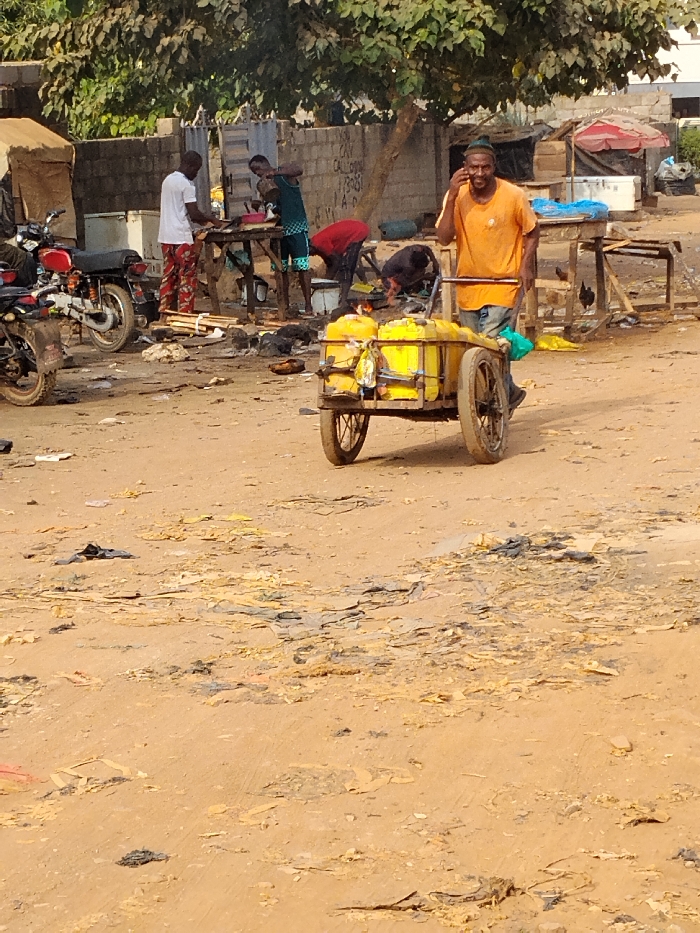 This image depicts an outdoor commercial area in Abuja, Nigeria, under bright daylight. The ground is reddish-brown dirt, uneven, and covered with scattered debris, including dark plastic and light-colored fragments. In the foreground, a dark-skinned man, wearing an orange t-shirt, dark trousers, and a dark green skullcap, walks from left to right, pulling a yellow, two-wheeled wooden cart. He holds a dark object to his right ear, consistent with a mobile phone, and exhibits a slight smile. The cart transports three yellow plastic jerrycans secured with straps, and a green plastic bag hangs from its right side. In the midground, to the left, two motorcycles are parked: a red one partially obscured, and a black one. Further right, a group of four dark-skinned men are engaged in activities around a rustic wooden table. One man, wearing a white t-shirt and red-patterned trousers, stands left of the table, appearing to cut an item. Another man, in a dark green sleeveless top and shorts, stands right of the table, attending to a bowl or pan positioned over a small ground fire that emits smoke. Two additional men, one in a red t-shirt and another in dark clothing, are bent over near the ground fire. The ground in this area is littered with wood scraps, burnt material, and general refuse. A white cooler is visible behind the motorcycles, near a makeshift structure with a dark roof. The background features a concrete block wall with visible text and a wooden gate. Green-leafed trees are interspersed across the scene. To the far right, behind the man with the cart, are additional wooden structures, including one with a small, faded red and white umbrella, and another white refrigerator-like unit.