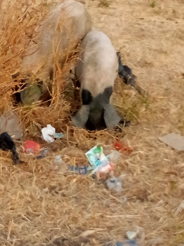 Two pigs are foraging in a grassy area strewn with trash. One pig is mostly obscured by vegetation, while the other is more visible, its gray and white body positioned head-down amidst the scattered debris. The ground is covered in dry grass and various discarded items, indicating a polluted environment. The scene appears to be a rural area.