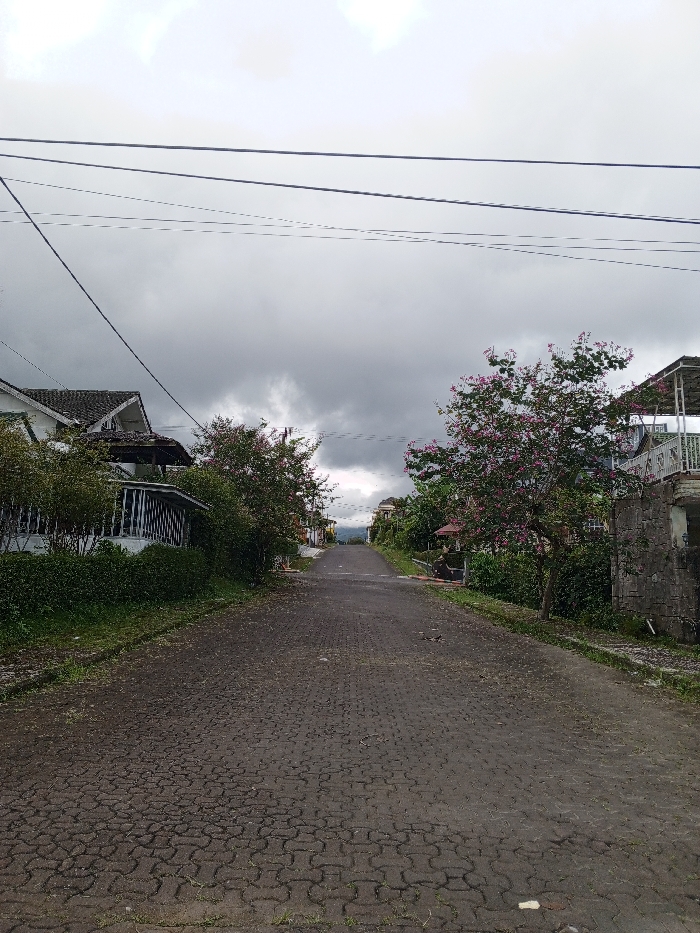 The image displays a residential street in Catarman, Philippines, under a uniformly overcast sky. The roadway is paved with dark, interlocking block pavers, extending uphill into the distant background. On the left side, a white two-story house with a dark-tiled roof and a screened or glass-enclosed balcony is partially visible behind dense green bushes and foliage. Multiple dark utility lines are strung horizontally across the upper third of the frame. On the right side, a multi-level house with a white-railed balcony and a stone-faced lower section is present, partially obscured by a prominent tree with abundant pink blossoms and green leaves. Further down on the right, a smaller structure with a reddish-brown roof is discernible behind vegetation. No individuals, animals, or vehicles are present in the scene. The overall environment appears quiet, with heavy grey clouds suggesting an overcast weather condition.