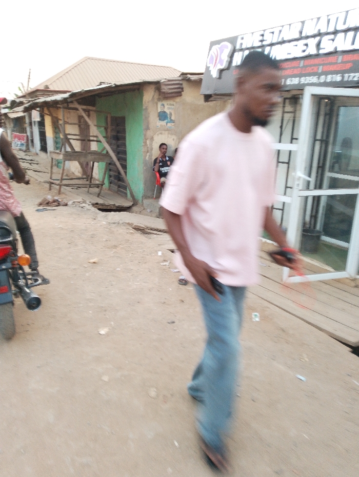 A man wearing a pink shirt and jeans walks in front of a building with a "Five Star Unisex Salon" sign. Another man sits in a red chair in front of an adjacent, smaller building. A motorcycle is parked on the left. The scene appears to be a dusty street with various structures and objects scattered around. The man walking is slightly blurred due to motion.