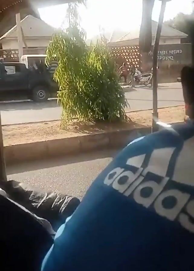 The video, taken from inside a moving vehicle, shows a sunny street scene