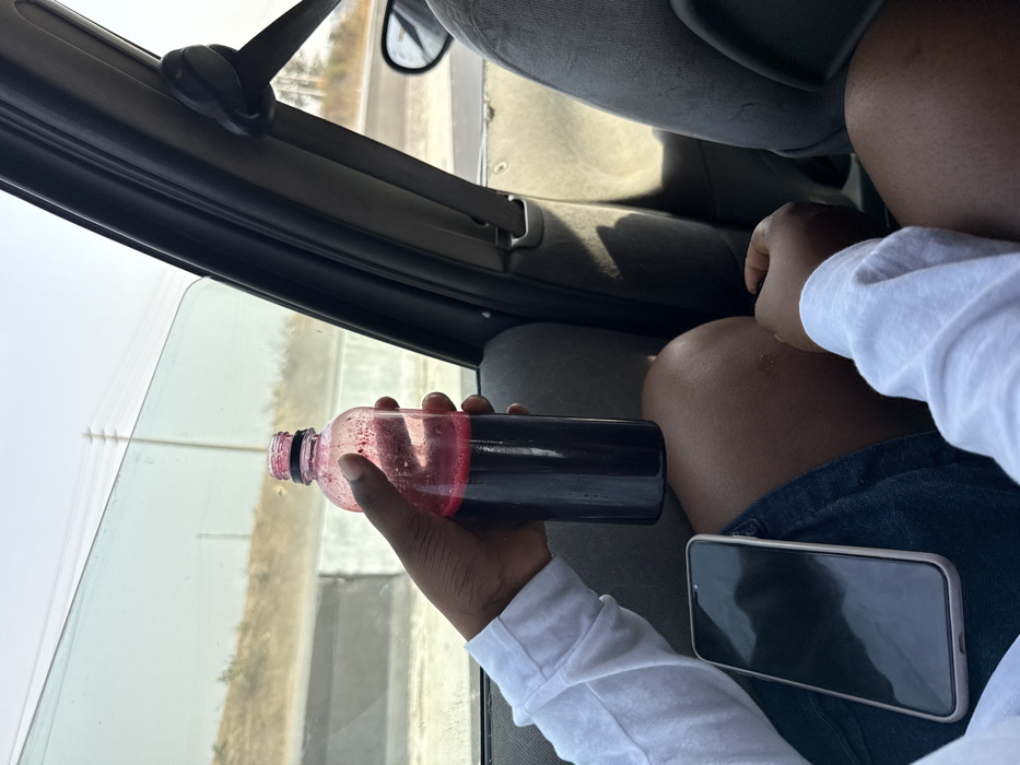 The image depicts a scene from inside a vehicle on a roadside in Keffi, Nigeria. A person with dark-toned skin is seated, wearing a white long-sleeved shirt and blue denim shorts. Their right hand holds a clear plastic bottle containing a dark purple liquid that fills approximately two-thirds of the bottle. Above the liquid, red residue is present on the interior walls of the bottle. A smartphone, housed in a light-colored case with a dark, inactive screen, rests horizontally on the person's left thigh. The vehicle's interior elements visible on the right include a dark gray door frame and a seatbelt mechanism attached to the B-pillar. Through the car window on the left, an exterior view of a multi-lane road is visible, featuring a low concrete barrier. Beyond the barrier, sparse green vegetation and two utility poles with overhead lines are discernible under a hazy, light sky. A side-view mirror is partially visible on the far right, reflecting a portion of the exterior.