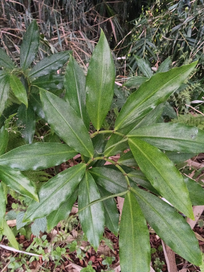 The image displays a close-up, overhead view of a leafy plant, located in the city of Kyauk Hsoke, Myanmar. The primary subject is a plant featuring multiple vibrant green leaves, generally lanceolate to elongated-ovate in shape, arranged along visible green stems. Some leaves exhibit minor surface variations or light dust. The immediate ground directly beneath the plant consists of soil, interspersed with small patches of green vegetation, and scattered organic debris, including dried leaves and small twigs in shades of brown and reddish-brown. The background, out of focus, shows dense foliage composed of various green plants, with indications of slender, upright stalks, possibly bamboo or similar vegetation, and additional dry plant material. No people, animals, or man-made structures are visible within the frame.