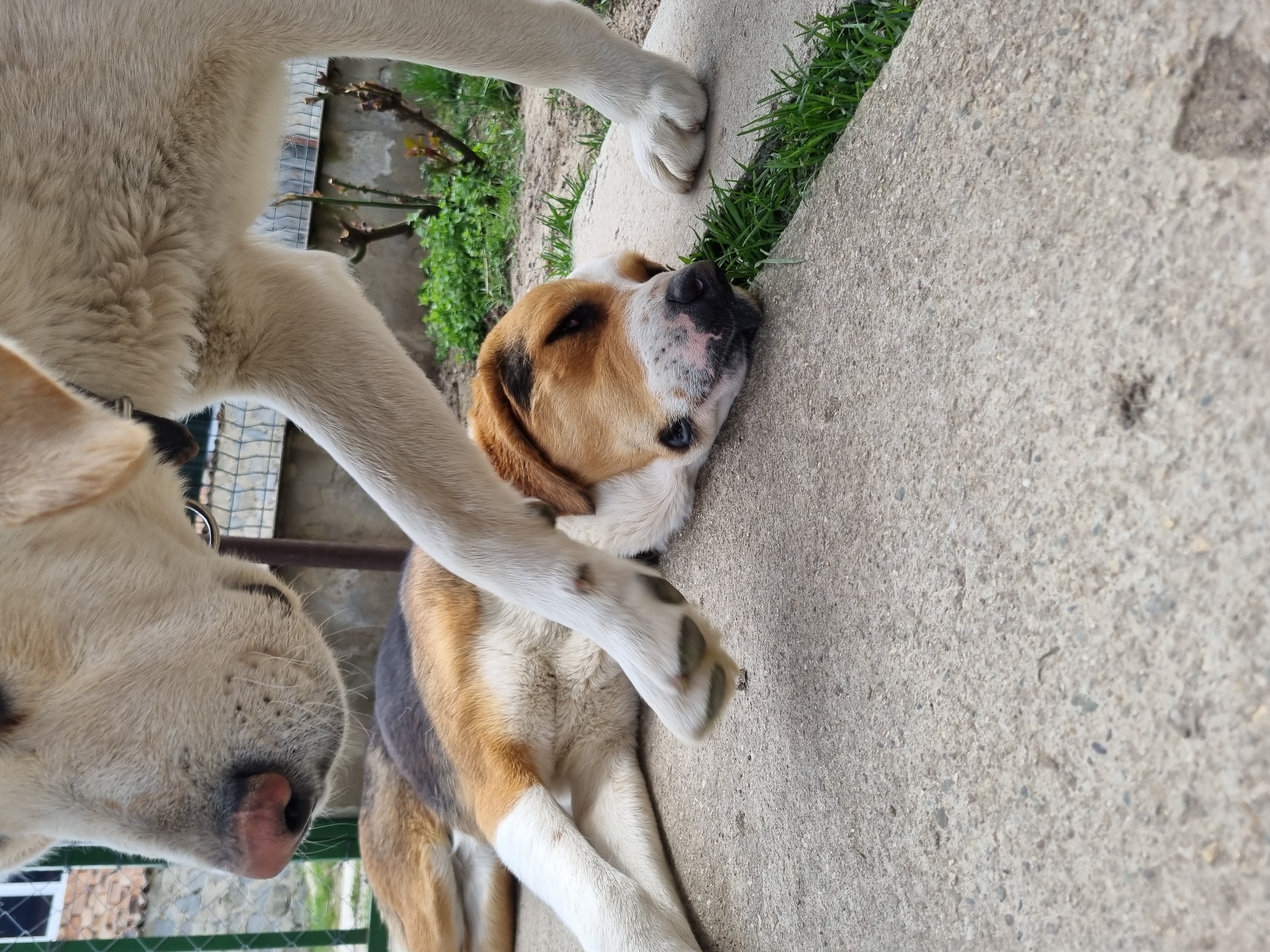The image depicts two dogs on a concrete surface. One dog, with tan and white fur, rests its head on the concrete. The other dog, predominantly white, stands over it, its paw touching the first dog's head. The location is Galabovtsi, Bulgaria. Additional details include grass and foliage along the edge of the concrete and a partial view of a fence in the background.