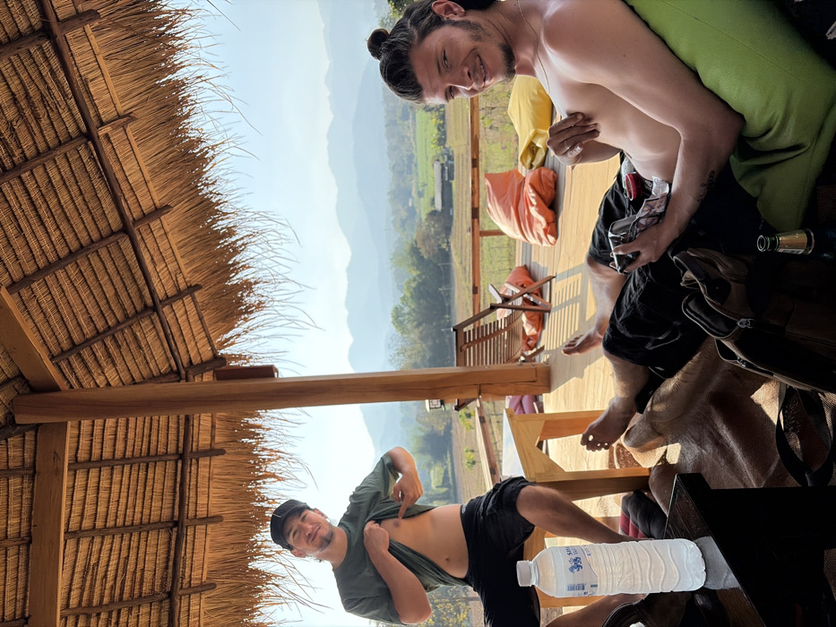- "Two adult males are positioned on a wooden deck beneath a thatched roof structure in Ban Mae Ping, Thailand" by FM-nyiZs1, licensed under CC BY 4.0