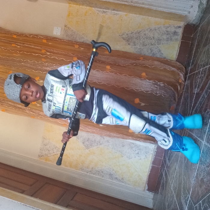 A young boy, approximately 4-6 years old, stands centrally in an indoor setting in Sabon Tasha, Nigeria. He wears a gray and black checkered flat cap worn backward, a black and silver futuristic-themed costume with printed blue details, and bright blue padded boots with lighter blue fur lining. The boy holds a black, segmented staff horizontally with both hands, positioned across his chest. His gaze is directed slightly to the left, and his mouth is slightly open. The background on the left features a dark brown wooden door. The wall behind the boy is light-colored with a subtle, textured pattern. A translucent orange-brown curtain hangs on the right, partially obscuring the wall, where a white electrical outlet is visible. The floor is covered with dark, reflective patterned tiles.