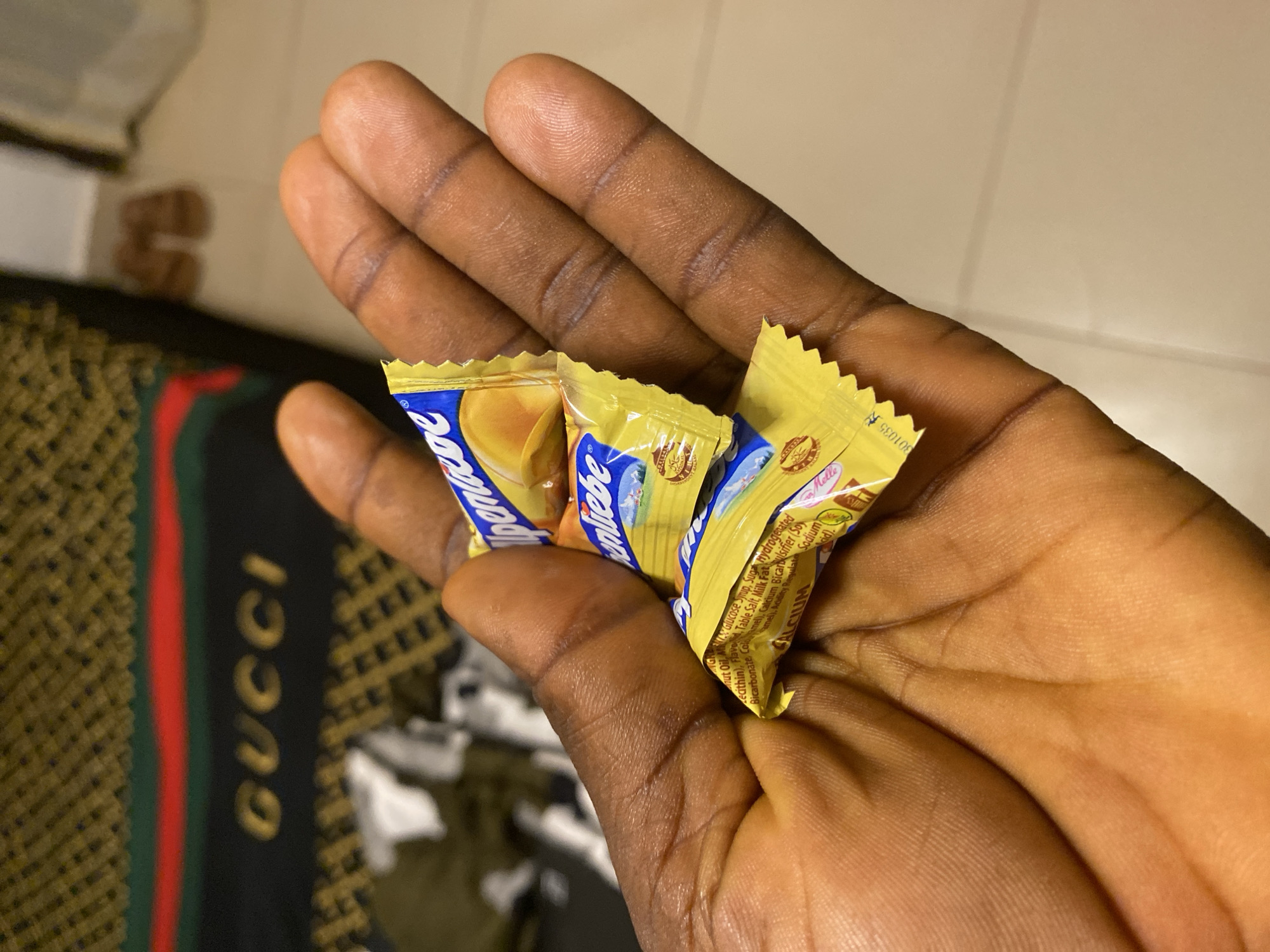 A medium close-up shot presents a person's hand holding three individually wrapped Alpenliebe candy pieces. The hand is brown-skinned, with visible lines and textures on the palm. The candy wrappers are primarily yellow and blue, with serrated edges. The words "Alpenliebe" are printed on the wrappers. The background shows part of a floor mat with the word "GUCCI" printed on it in large letters with a red stripe in the middle. The general location of the image is Nsukka, Nigeria.
