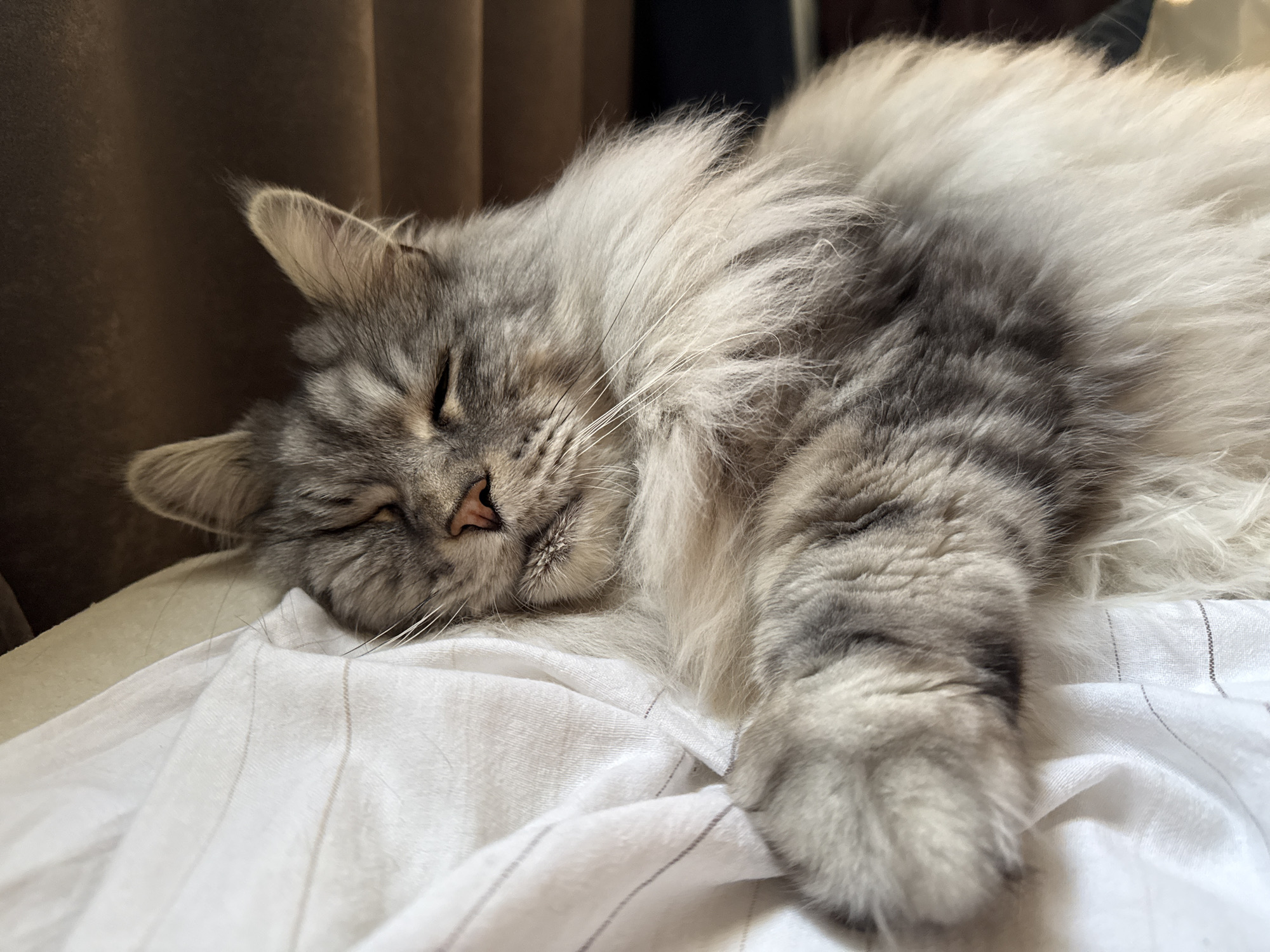 A long-haired gray and white cat is lying on a white sheet with narrow gray stripes. The cat is asleep, with its eyes closed and paws outstretched. The background consists of a brown curtain. There is no evidence to suggest this image was taken in Haskovo, Bulgaria.