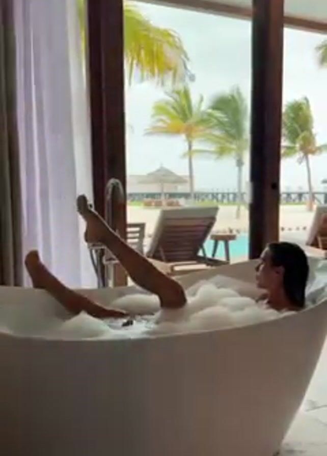 A woman is sitting in a white bathtub full of bubbles in a room with floor-to-ceiling sliding glass doors that open to a beach with palm trees and lounge chairs. She has her legs raised in the air. The room is bright and the scene appears to be from a high-end resort or vacation rental. There is a silver faucet attached to the side of the tub. The woman is facing away from the camera and has wet hair.