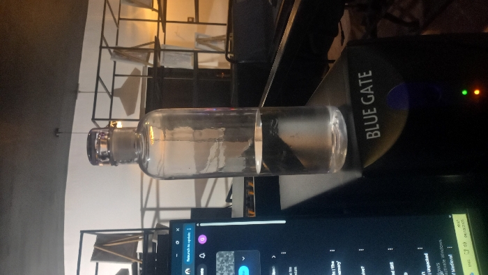 The image presents a static indoor scene within a commercial or professional establishment in Abuja, Nigeria. In the foreground, a clear glass bottle, approximately half-filled with a transparent liquid and sealed with a clear glass stopper, rests centrally on a black electronic device. The device is branded "BLUE GATE" in white text and exhibits a series of illuminated indicator lights: a blue (partially visible), a green, and an orange-red. To the immediate left, a segment of a computer monitor displays a dark-themed operating system or application interface, including a "Relaunch to update" prompt and a taskbar indicating the date 08/10/2023. The background is dimly illuminated, revealing dark-colored metal shelving structures holding multiple items resembling art canvases on easels or framed panels. A single hanging light fixture is visible overhead. No individuals are present in the frame.