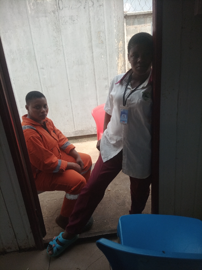 Two women are captured indoors with natural light illuminating the space. One woman is seated, dressed in an orange jumpsuit and light blue sandals. The other stands partially in a doorway, clad in a white top, maroon trousers, and an identification card. The backdrop features a weathered grey wall with faint numbers, and hints of outdoor elements like a wire fence are visible. An open doorway frames the scene, with glimpses of colorful plastic chairs adding to the indoor setting.