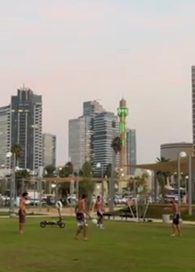 The video captures a group of four shirtless men playing a game on a grassy field, possibly soccer, with buildings silhouetted in the background. The sky is a soft mix of pink and light blue suggesting either dawn or dusk. In the foreground, there is a scooter parked on the grass. Behind the men, the buildings are a mix of sizes and shapes with one distinctive tower illuminated in green. There are some sparsely placed palm trees, street lights, and what appear to be covered seating areas. The camera remains static.