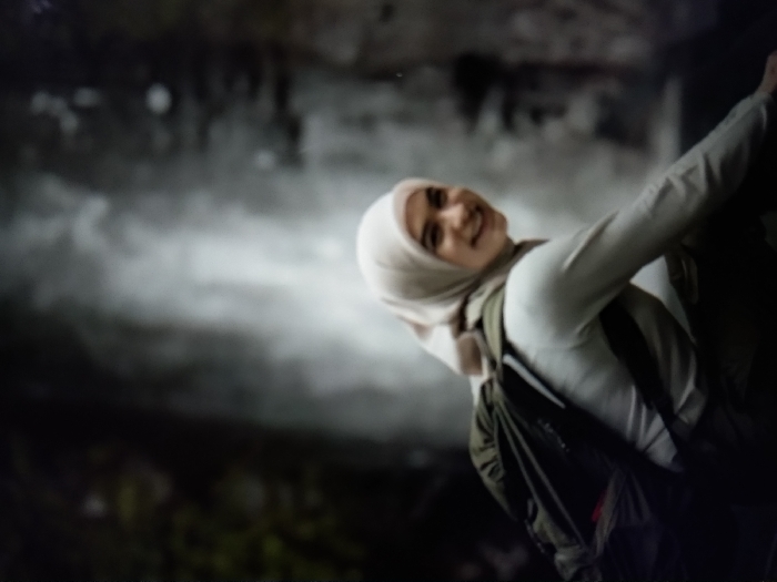 A female individual is depicted in a natural outdoor setting, positioned in front of a prominent waterfall. She is observed in a crouched or kneeling posture, turned slightly to her left, but with her head rotated to face the camera directly. She exhibits a wide smile. Her attire consists of a light-colored, long-sleeved top and a matching light-colored hijab. A dark-colored backpack is worn over her shoulders. The background features a large waterfall, appearing misty and blurred, indicative of falling water. Dark, indistinct natural formations, likely rock faces or dense foliage, flank the waterfall on both sides. The lighting is diffused, consistent with an outdoor, potentially shaded or misty environment. This scene is located at a waterfall within the city of Bogor, Indonesia.