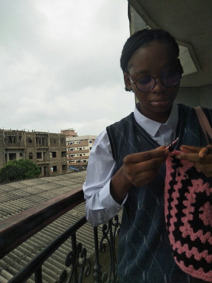 An individual with dark skin, braided hair, and round glasses is positioned on a balcony in an urban area of Cotonou, Benin. They are wearing a white collared shirt and a dark argyle sweater vest. The person is actively engaged in crocheting, holding a black crochet hook and manipulating a partially completed item featuring a pink and black granny square pattern. A light pink strap is visible over their right shoulder. The balcony railing in the foreground is dark-colored metal with decorative scrollwork. Below the balcony, an extensive grey corrugated roof is visible. The background features several buildings: an unfinished, multi-story concrete structure with exposed framework to the left, and a more developed multi-story building with a light facade and dark window frames to the right. A green tree is situated between the roof and the unfinished building. The sky is uniformly overcast.