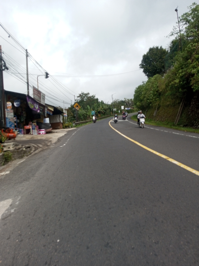 The image presents a street scene in Saing Ta Mawt Lay, Myanmar, under an overcast sky. A dark asphalt road, marked with a solid yellow center line, dominates the lower half of the frame and curves gradually to the right, ascending slightly into the distance. On the left side of the road, a low-slung commercial building, possibly a shop, is visible with merchandise and an orange gas cylinder displayed outside. Numerous utility poles with a dense network of overhead wires run along the left, with a traffic signal suspended above the road. On the right side, a steep, green hillside, densely covered with trees and vegetation, borders the road, with a stone retaining wall visible at its base in parts. A yellow diamond-shaped road sign with a black symbol is positioned on the right shoulder. Five individuals are visible, each riding a motor scooter or small motorcycle, traveling away from the camera along the curve of the road. The immediate foreground shows the texture of the asphalt road surface.