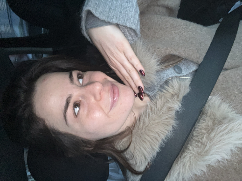A woman is depicted from the upper torso, seated in what appears to be a vehicle, secured by a dark seatbelt across her chest. She possesses dark brown hair and brown eyes, looking towards the right side of the frame with a subtle smile. Her left hand is raised, fingers lightly touching her jawline, revealing metallic red nail polish. She wears a light brown or beige coat with a shaggy, lighter beige faux fur collar. A grey garment with a button and zipper is visible beneath the coat. The background is dark and indistinct, consistent with a car interior at night or in low light conditions. The specific location within Villeneuve-d'Ascq, France, is not discernible from the provided image.