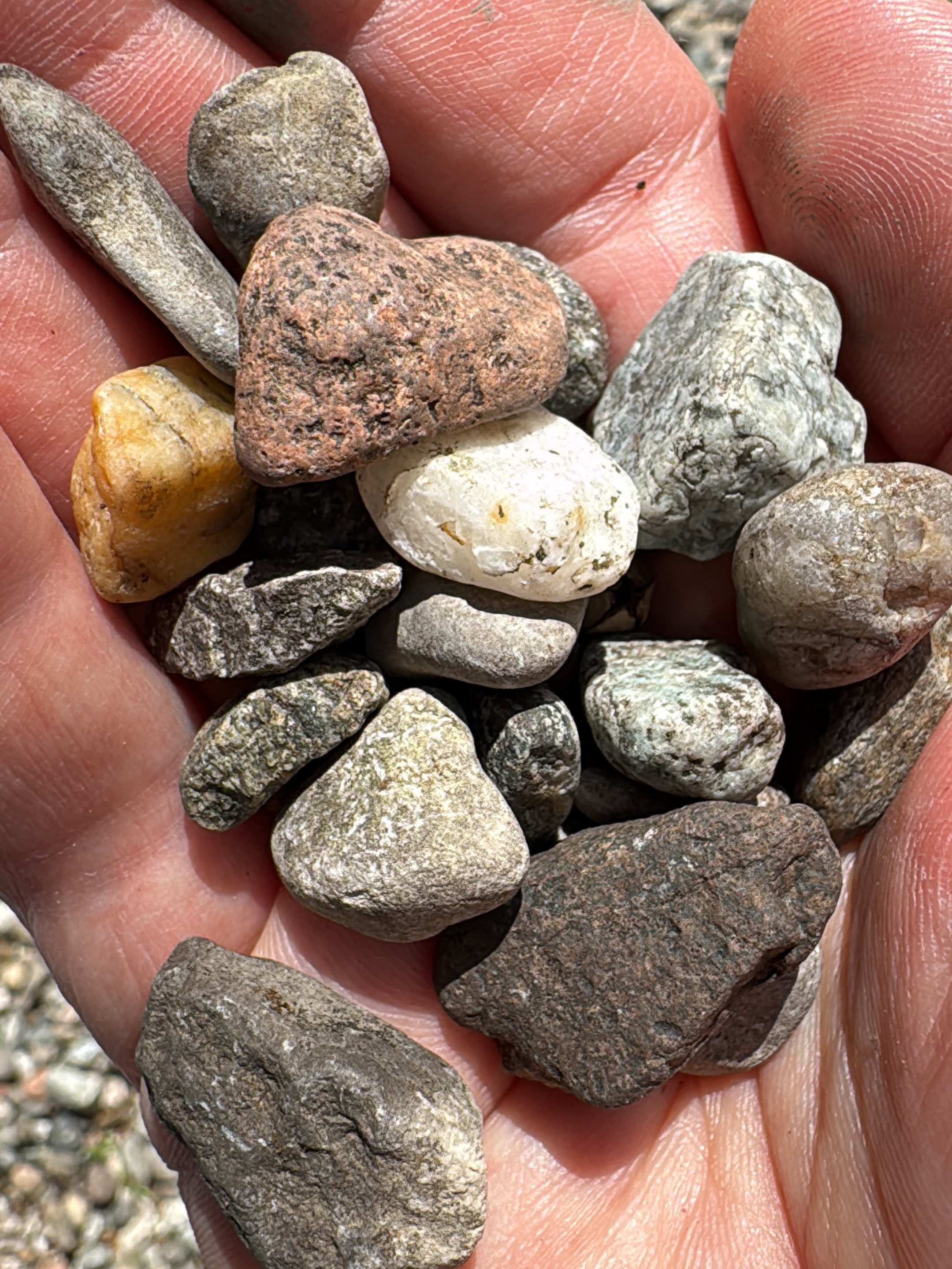A close-up image depicts an individual's cupped left hand, illuminated by direct sunlight, holding approximately two dozen small, multi-colored pebbles