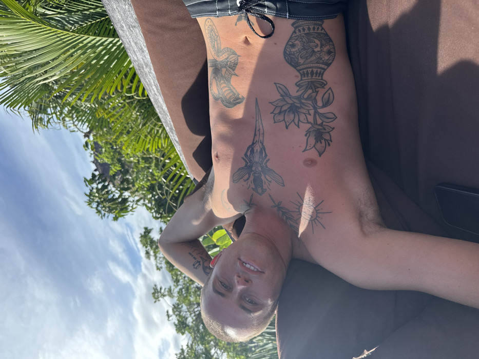 A fair-skinned man with tattoos rests on a brown lounge chair outdoors. He wears dark swim trunks. The tattoos feature images like a vase, flowers, and insects on his torso. He looks towards the camera and smiles. Palm trees and a bright blue sky are visible in the background.