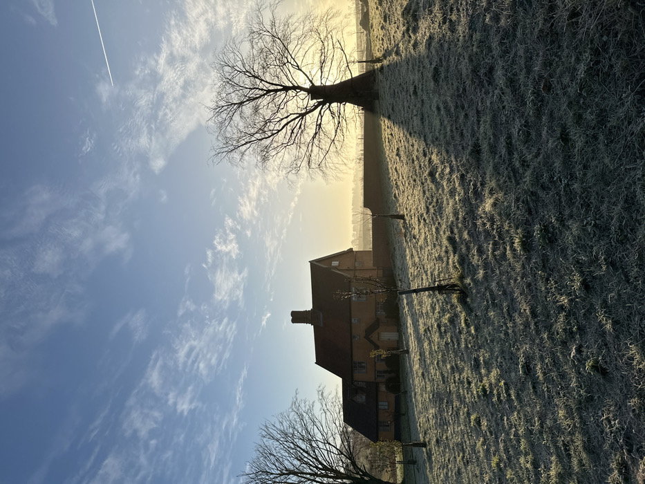 The image depicts a frosted rural landscape in East Suffolk, United Kingdom, under a clear, pale blue sky with scattered cirrus clouds. A faint white contrail is visible in the upper right quadrant of the sky. The scene is illuminated by a low sun, positioned towards the right, casting a bright, golden haze across the horizon and generating long, distinct shadows. In the midground, slightly left of center, stands a two-story building of ochre hue with a dark reddish-brown tiled roof and a prominent central brick chimney. To the immediate right of this building, a low, reddish-brown brick wall extends horizontally. A large, leafless deciduous tree with a thick, dark trunk and extensive bare branches is positioned to the right of the wall, silhouetted against the bright background. This tree casts a long, dark, triangular shadow diagonally across the frosty terrain towards the viewer. The foreground is dominated by a gently sloping field of short grass, uniformly covered in a visible layer of white frost. Scattered across this frosty field are several slender, bare saplings, some supported by individual wooden stakes. To the far left, another leafless deciduous tree is partially visible behind the main building. No individuals, animals, or specific actions are depicted within the frame. The environment is characterized by clear, cold conditions.