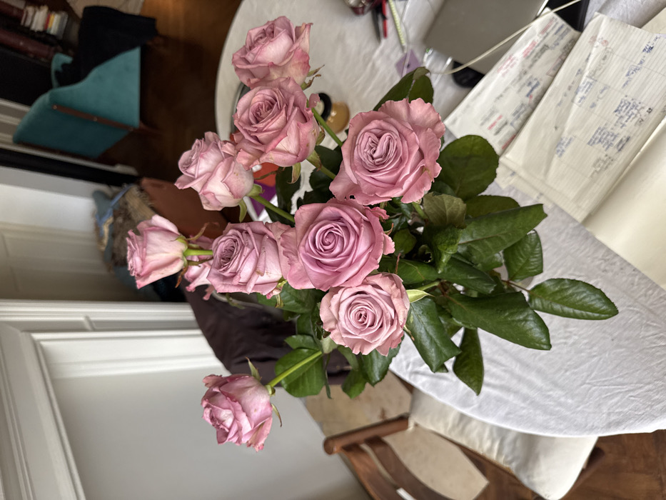 This image displays an indoor setting within a residence in Saint-Gilles - Sint-Gillis, Belgium. The central subject is a bouquet of approximately twelve light purple-pink roses with prominent green stems and leaves, contained within an unidentifiable vase on a white, textured tablecloth. The table, likely round, features a small, amber-colored jar behind the floral arrangement and a stack of printed white papers alongside a dark, rectangular object to the right foreground. In the background to the left, a wooden chair with a light-colored cushion is partially visible, adjacent to a white wall section featuring architectural molding. The background to the right reveals a teal upholstered armchair with visible wooden framing situated on a dark wooden floor. A bookshelf containing various books is dimly visible beyond the armchair. No individuals or specific actions are depicted.