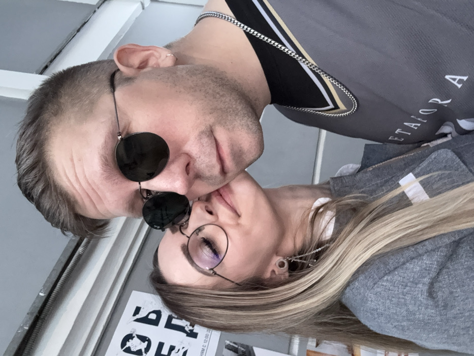 An eye-level close-up photograph depicts two individuals, a female and a male, in an indoor or semi-indoor setting. The female subject, positioned on the left, has long, straight blonde hair with darker roots and highlights. She wears round, dark-rimmed eyeglasses, exhibiting a subtle purple reflection on the lenses. Her visible left eye is accented with dark eyeliner and mascara. A stretched piercing (flesh tunnel) is present in her left earlobe, from which a silver-toned earring composed of multiple chains dangles. She is dressed in a light grey zip-up jacket worn over a white collared shirt. Her head is tilted upwards, with her right cheek pressed against the male subject's right cheek. Her mouth is slightly parted. The male subject, on the right, has short, dark hair with faded sides and visible facial stubble. He wears round, dark-lensed sunglasses with thin dark frames and a small silver hoop earring in his right earlobe. He is dressed in a grey shirt or jersey featuring black and a lighter-colored stripe (possibly gold or tan) around the collar. A silver-toned Cuban link chain necklace is prominent over his shirt, which also displays partially visible white text, 'ETAIOR A', on its front. He maintains a neutral expression, looking forward. The background on the left features a partially visible white rectangular poster affixed to a wall. The poster displays black Cyrillic text and graphic elements; identifiable text fragments include "ОБЪЕ" and "СРМ С 12:00 ДО". This text indicates a Russian-speaking environment, consistent with a location in Russia, such as Moscow, although specific identification of a precise location within the city is not possible from the image alone. Above the poster and to the right, the background consists of light-colored, horizontal structural elements or panels. The lighting is soft and uniform.