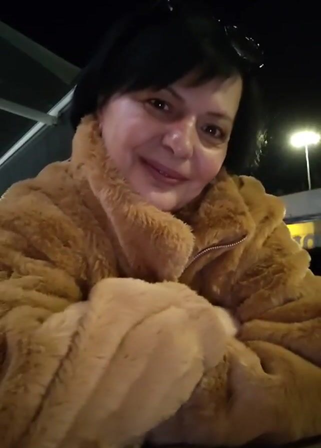 A woman is seated at a table, smiling directly at the camera. She has short, dark hair and is wearing a brown, furry coat. Sunglasses are perched on top of her head. The background is dark, with some lights visible in the distance. The woman's arms are crossed in front of her.