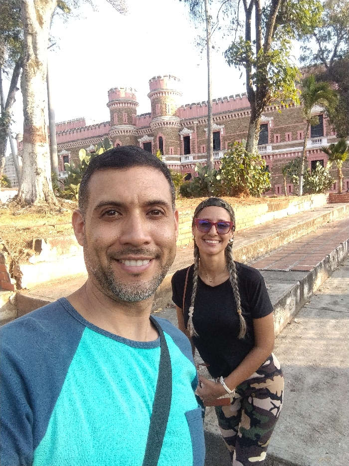 A smiling man and woman pose for a selfie with a unique building in the background. The man wears a teal and blue shirt with a strap, while the woman sports a black shirt, camouflage pants, and braids. The building behind them appears to be an old-fashioned pink and brown castle. Tall trees and greenery surround the structure, and a brick walkway is nearby. The image captures a sunny day outing.