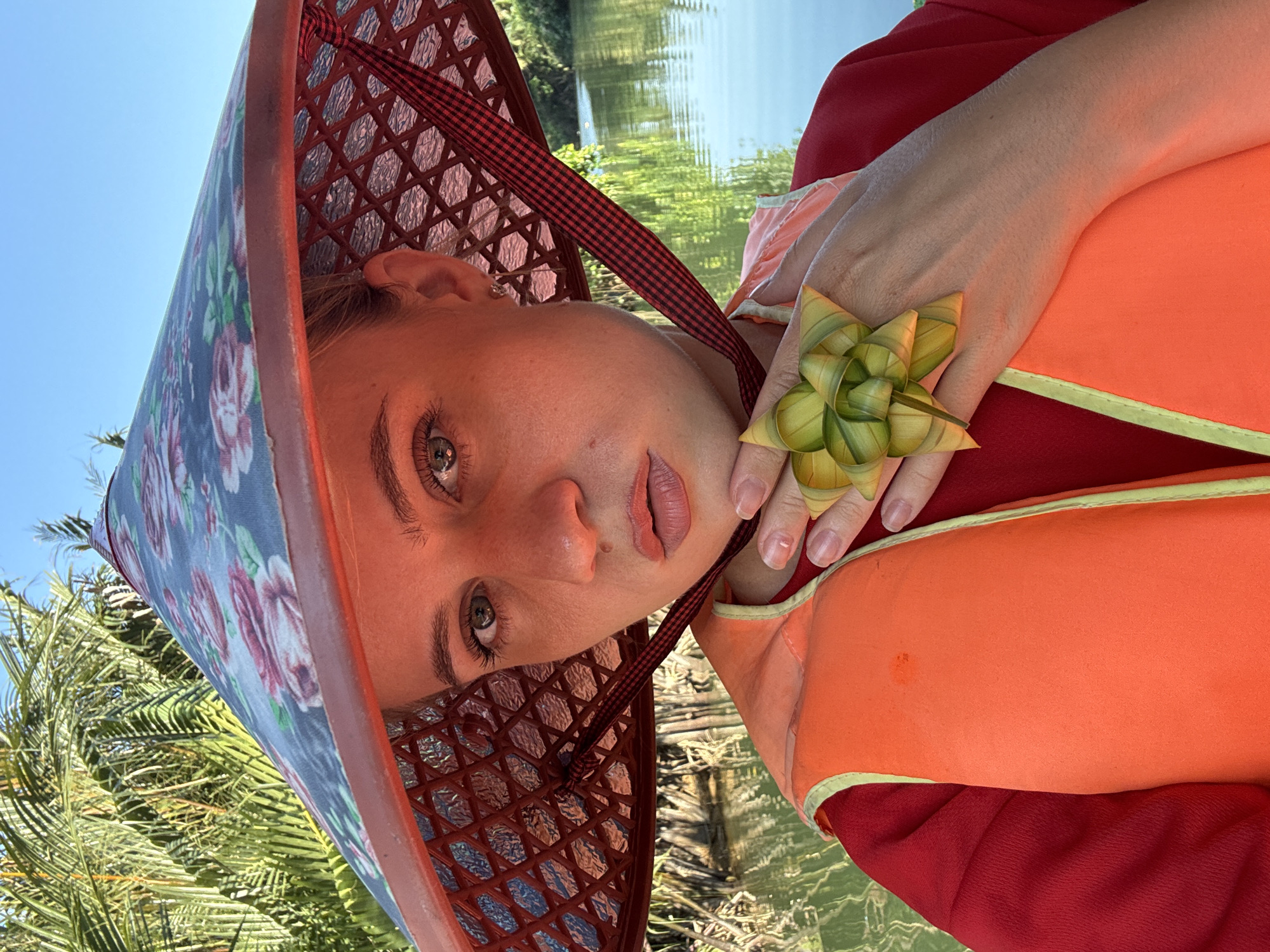 A fair-skinned person, likely female, is wearing an Asian conical hat with a floral pattern, a red shirt, and an orange life vest with yellow trim. The person is also wearing a flower-shaped ring made of woven green palm leaves on their right hand. The background includes water, likely a river or lake, with reflections of trees and sky. Palm trees are visible on the left side of the image. The scene appears to be in a tropical location, possibly near the city of Đà Nẵng, Vietnam, as conical hats are commonly worn in that region.