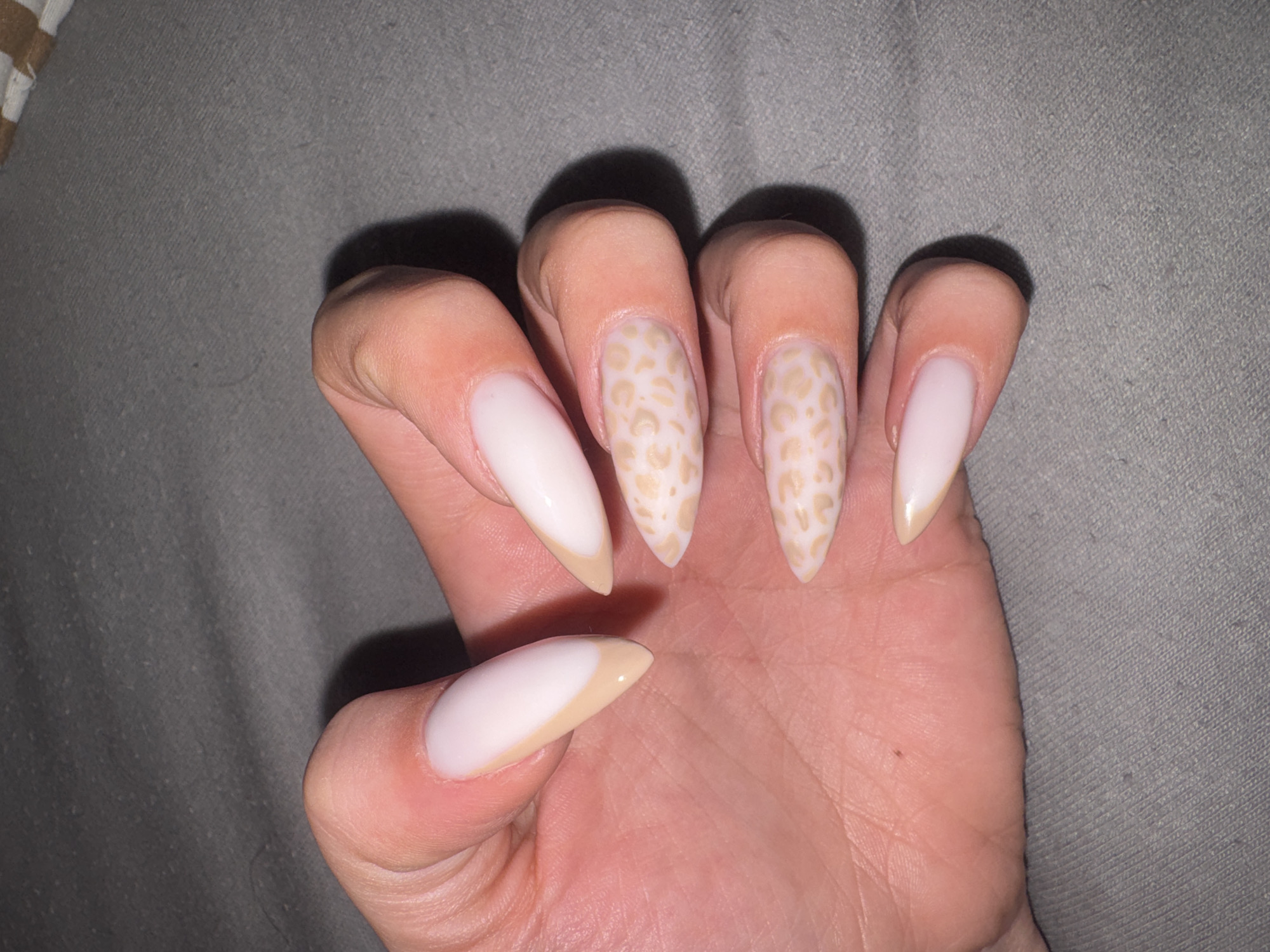 A human left hand is depicted in a close-up, resting on a textured, plain gray fabric surface. The palm is visible, with fingers slightly curled. Five artificial, stiletto-shaped fingernails are present. The thumb and pinky nails feature a milky pink base with a solid beige/tan tip. The index, middle, and ring fingers display a milky pink base adorned with a beige/tan leopard print pattern. The skin tone of the hand is light to medium peach, and a small, dark reddish-brown mark is visible on the palm below the index finger. Soft, possibly artificial, illumination originating from the upper-left casts a partial shadow of the hand onto the gray fabric. No discernible architectural, environmental, or contextual features within the image indicate a specific location in Plovdiv, Bulgaria.